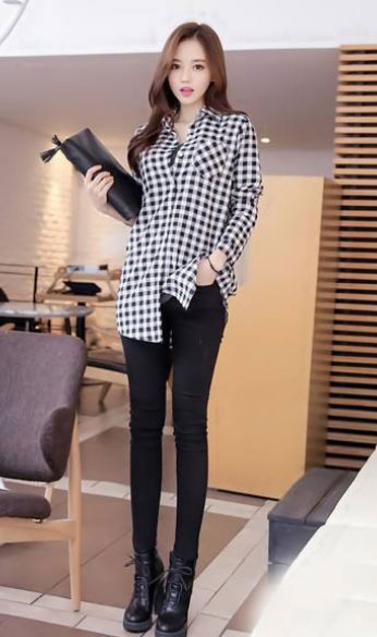 格子襯衫+黑色小腳褲